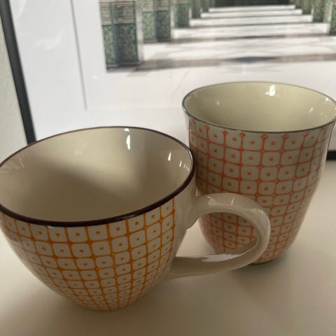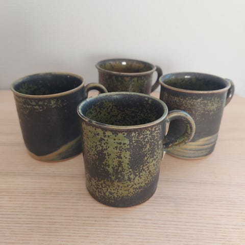 4 morsomme retro kopper i keramikk. 70talls. Nydelige farger. Spanske? Flott fasong og uten bruksspor. 10 cm høye. 8 cm på det bredeste. 5,5 cm på tvers øverst. Samlet pris