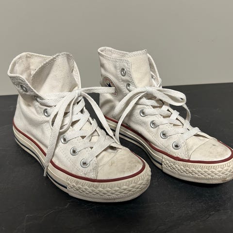 Converse All Star sneakers joggesko i størrelse 36,5 med høy såle. Skoene er svarte med hvite detaljer og laget i tekstilmateriale. Passer til daglig bruk og har klassisk design med høyt skaft. Pent brukt to uker på påskeferie i varmere strøk av 12-åringen vår.