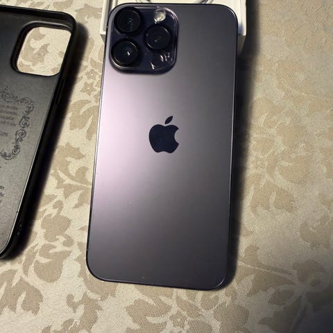 Apple iPhone 14 Promax mobiltelefon i svart farge. Den er knust bak, som vist på bilde. 256 GB