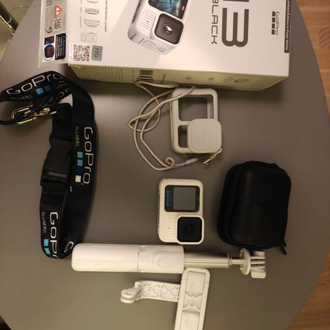GoPro HERO 12 Black actionkamera med extra wide lens mod 2.0, to batterier, dobbel batterilader, USB-kabel og flere monteringsfester. Kameraet er designet for utendørs og sportsbruk, og leveres med tilbehør for fleksibel montering og lading.