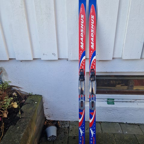 Madshus langrennsski med rottefellabindinger, 130 cm. Smøreski. Godt brukt med enkelte bruksmerker, men ingen defekte deler.