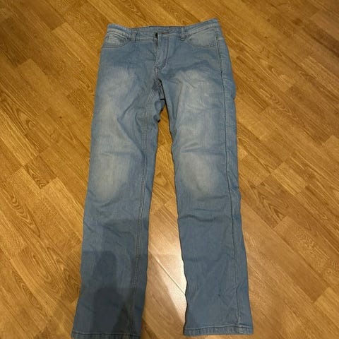 Motorsykkelbukse i størrelse W29 L32 laget av 100% bomull med forsterkning i 100% kevlar. Buksa har fôr i kevlar og er designet for slitestyrke.