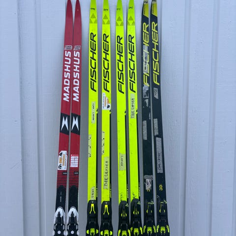 Mangler klemmene for å feste skia, disse kjøpes løst.