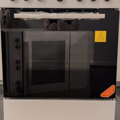 AEG induksjonskomfyr. Komfyren har to betjeningsknapper og et digitalt display for innstillinger. Ovnen har flere rilleposisjoner for stekebrett og en vifte for jevn varmefordeling. Farge er hvit med sort glass på ovnsdør og koketopp.