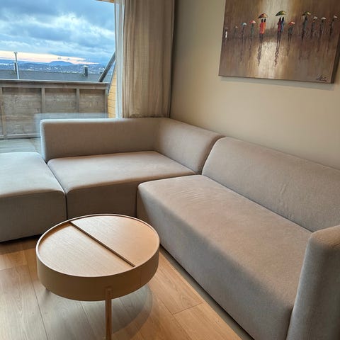 Stilig og elegant modulsofa/modul-hjørnesofa i beige farge fra Trademax. Sofaen har et moderne design og er laget for komfortabel sitteplass. Den passer til boliginnredning med behov for en romslig sitteplass. Vi har ikke barn i huset og sofaen er veldig godt velholdt av oss voksne. Kom gjerne å se den. Selges grunnet flytting. Kommer fra et dyrefri hjem :)