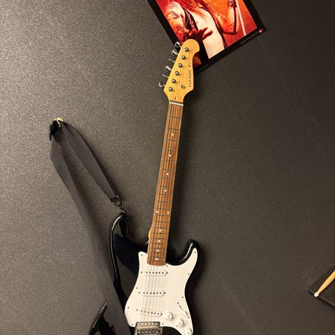 Baxter elektrisk gitar i rød farge. Gitaren har en tradisjonell kropp og halsdesign med flere kontrollknapper og en tremoloarm. Leveres med bæretaske fra Gear4music.