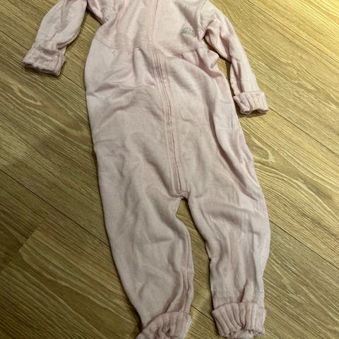 Lillelam ulldress i størrelse 86 for jente, laget av merinoull i rosa farge. Dressen har glidelås foran for enkel påkledning og et strukturert strikkemønster på bryst og ermer. Passer som varmeplagg for barn.