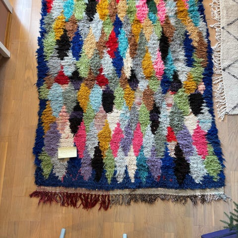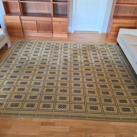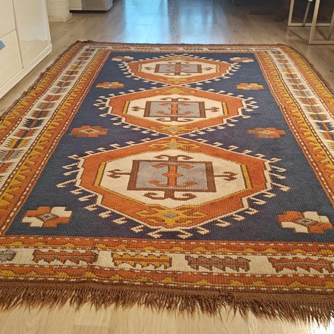 Kelim teppe fra Rugvista med geometrisk mønster i flere farger. Teppe med detaljert ramme og midtfelt i blått, omgitt av brune, beige og blågrønne nyanser. Passer til bruk i stue eller spisestue. Kjøpt i desember. Ny pris 5200 kr