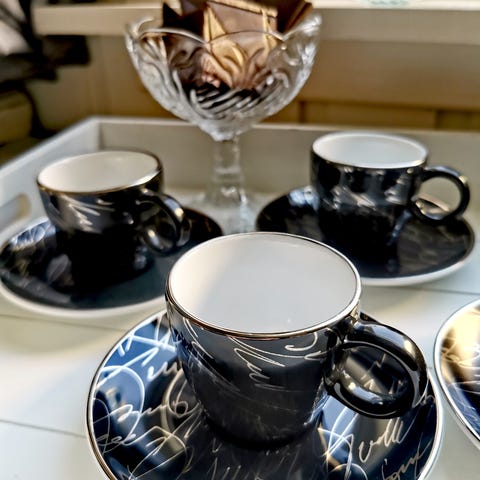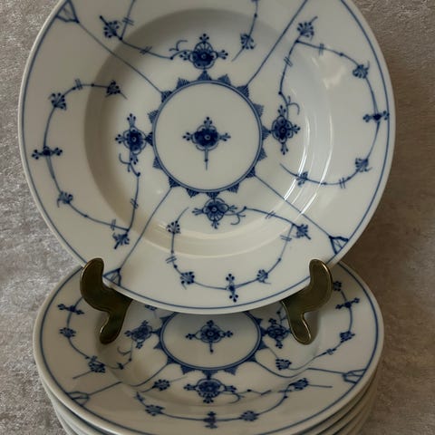 6 flotte suppetallerkener fra Porsgrund Porselen, med fint nåletre mønster langs kanten. 24 cm i diameter. SOM NYE - IKKE VÆRT I BRUK!
