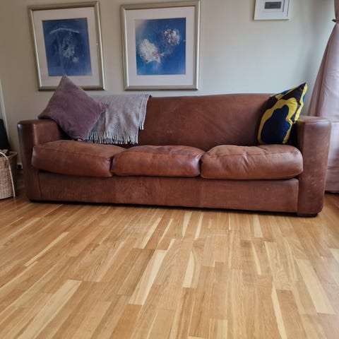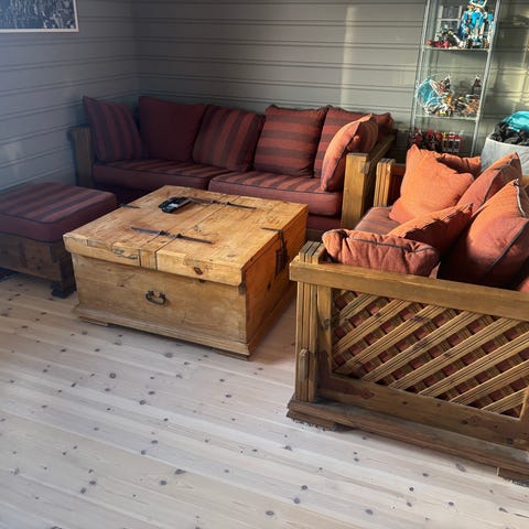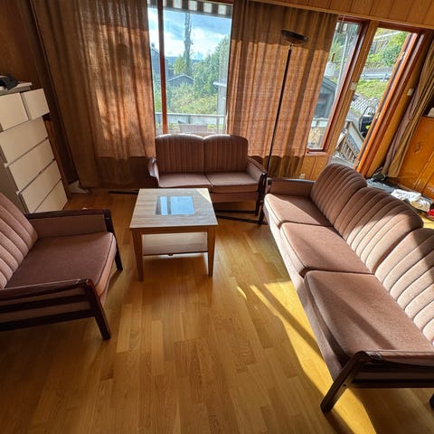 Sofa gruppe 3-2-1. mål, 3 seter 200 cm : 2 seter 140 cm .1 seter 70 cm og sitte høyden er ca 46 cm , sofaen ser hel og fin ut, ( den er helt komplett, 2 puter som ikke ses på bildet følger med ) selges kr 300.-. Hentes på 2637 Tretten