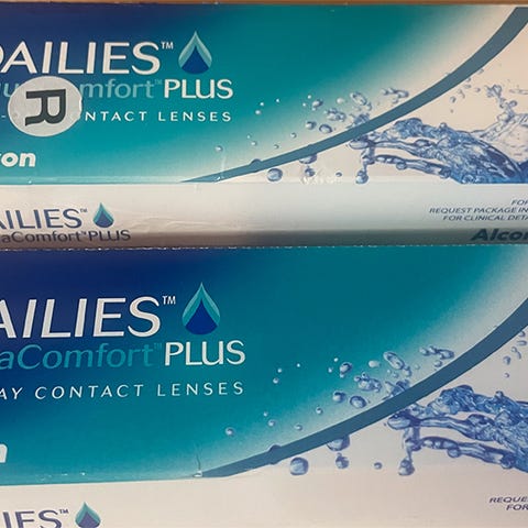 Precision 1 One-Day kontaktlinser i åpnet pakning med 25 linser. Diameter (DIA) 14.2 mm, basekurve (BC) 8.3 mm, styrke (PWR) -3.25. Designet for engangsbruk og unisex.