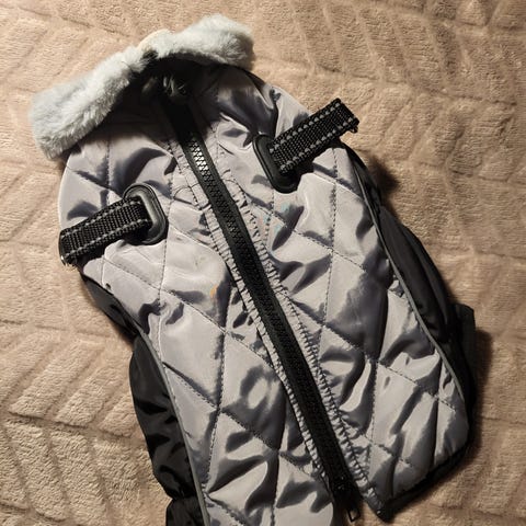 Helt ny og ubrukt vinterdekken til hund str 36cm. Tatt av lapp da vi prøvde den, men så vokste hunden litt raskere enn vi fikk behov for denne. Merke Trixi, integrert sele i denne her som