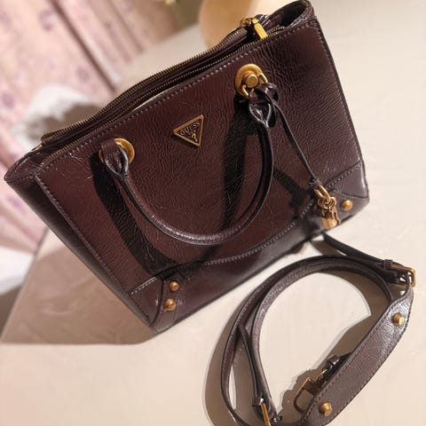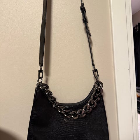 Nesten ubrukt GUESS skulderveske for unisex i svart lær. Vesken har justerbar skulderrem og glidelåslukking. Designet med mønster og metallogo på fronten.