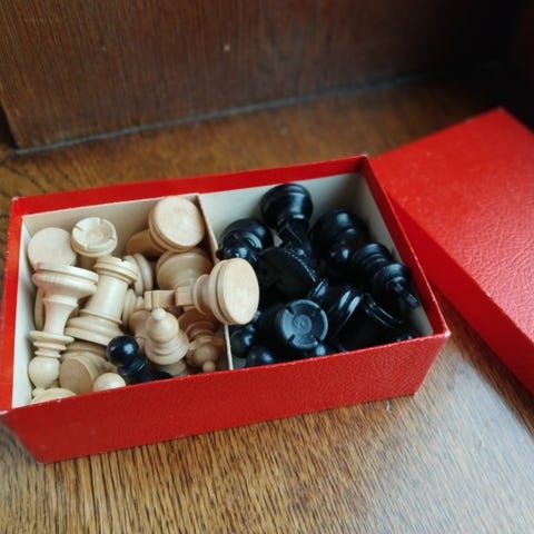Håndlaget sjakkbrett i tre med håndlaget sjakkbrikker