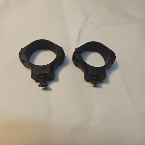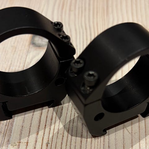 Selger et sett 1” (25,4 mm) kikkertsikteringer for Weaver / Picatinny (cross-slot) baser. Usikker på eksakt fabrikat / merke. Stålringer.