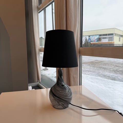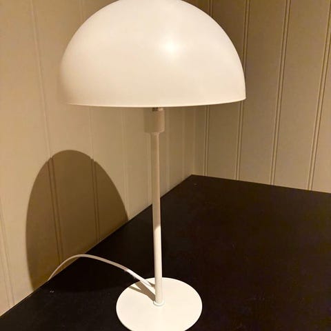 Liten bordlampe i hvit og med detaljer i sølv - den kan bøyes opp og ned og på sidene så er veldig praktisk og gir god leselys.