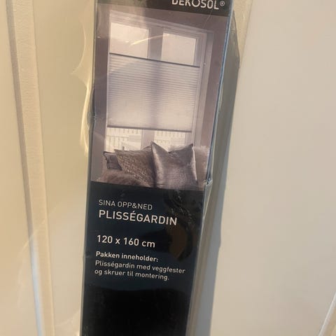 Plissegardin hvit fra Vest Markiser. Passer til vindu som er 163.5 cm bred og 184 cm høy. Magnetlist øverst som holder gardinen på plass når gardinen er helt oppe. Selges grunnet bytte av vindu.