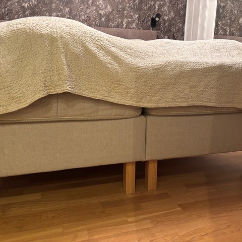 2 grå Jysk rammer i størrelsen 90 x 2 cm, med to madrasser fra IKEA i samme størrelse, toppet med en overmadrass med hvitt trekk med merket Tussøy fra IKEA. Sengen er tilpasset for standard bruk som dobbeltseng på 180 cm. Kun 1 år gammel og lite brukt. Veldig god stand. Må hentes.