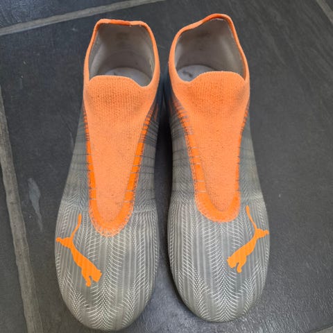 Veldig lite brukte Puma fotballsko til salgs. Guttungen fikk gnagsår av dem og har brukt dem 5 ganger før vi ga opp. Forhåpentligsvis passer de bedre på andre føtter.