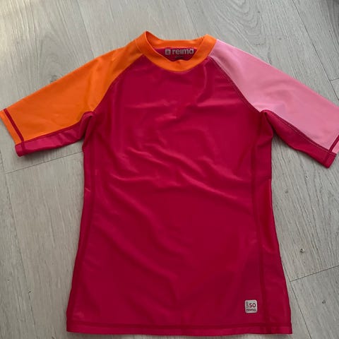 Skal du på solferie med barna? Reima bade- t-skjorte i størrelse 122 for jente. Laget av polyester med UV50-faktor. Litt usikker om den ble brukt noen ganger, men i tilfelle maks en gang
