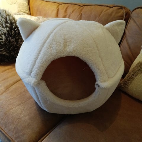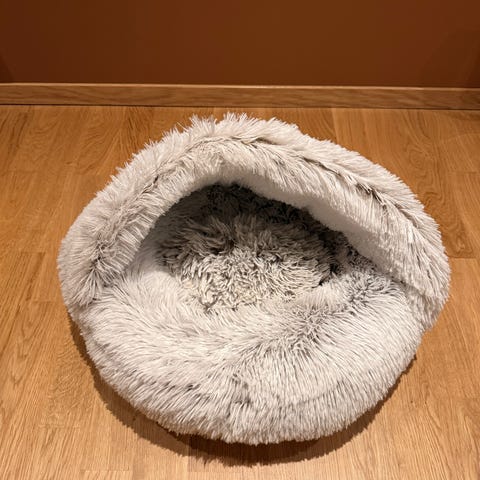 Selger en fin katteseng, kjøpt på Rusta.
