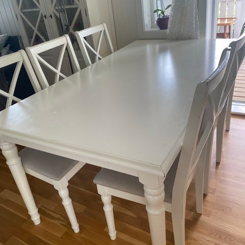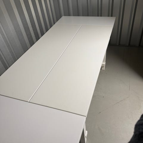 Spisebordet er pent brukt, men fikk dessverre noen skader under flytting og selges derfor billig. Det er et ellers solid spisebord og skadene kan sikkert pyntes på🤗