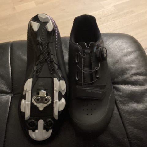 Giro sykkelsko i svart farge, størrelse 42. Svært små i størrelsen og passer til 40-41. Skoene er designet for sykling og har feste for klikkpedaler under sålen.