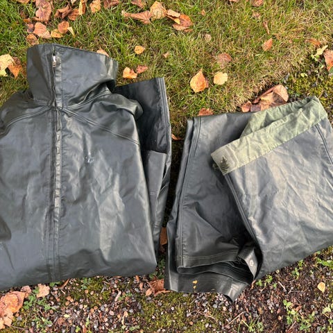 Regntøy, regnfrakk, regnjakke, regnhyre, oljebukse, oljejakke, oljeklede, oljeklæde, oljeklær, retro, pvc, vinyl, plast.