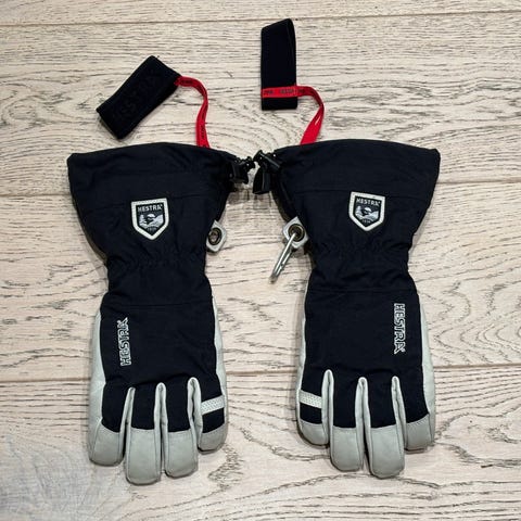 Pent brukte ski- og snowboardhansker i skinn med avtagbart ullfôr.