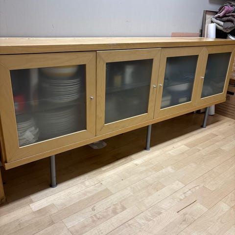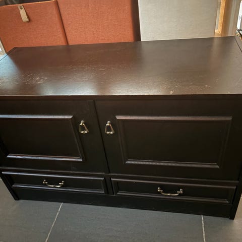Hvit skjenk med skap og skuffer med sort metallhåndtak