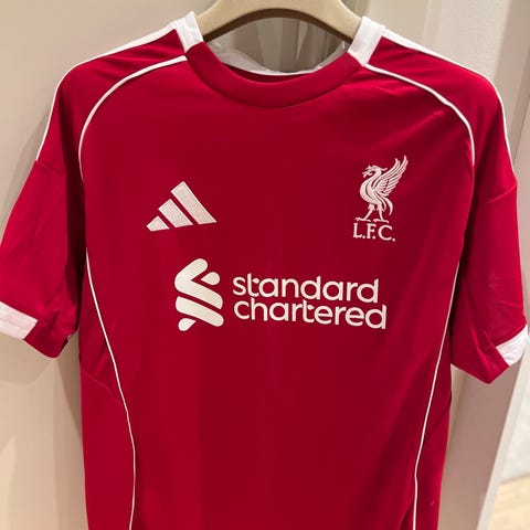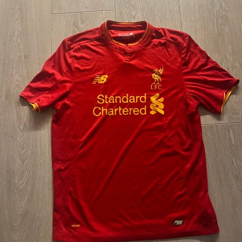 Adidas Liverpool fotballtrøye i størrelse M for menn. Selges da størrelsen ikke passer, men kan ikke byttes da det er trykket "Virgel" på baksiden av drakten. Ny pris 1100. Kvittering følger med