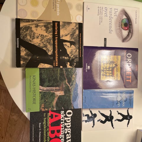 Samling av bøker relatert til psykologi og utdanning, inkludert titler som omhandler matematikk, forvaltningsrett, håndbok for ferske lærere, og vurdering for læring. Bøkene dekker fagområder som pedagogikk, rettslære og lærervirksomhet.
