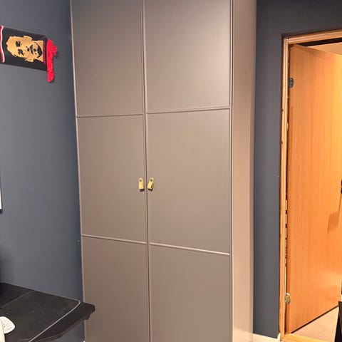 IKEA PAX garderobe med hvite Bergsbo dører. 2 stk 50 cm og en 100 cm. Dybde på skap 36 cm. Høyde 236 cm. Merker i skrog etter fastmontering mellom skap. Samt noen merker inne i skapene.