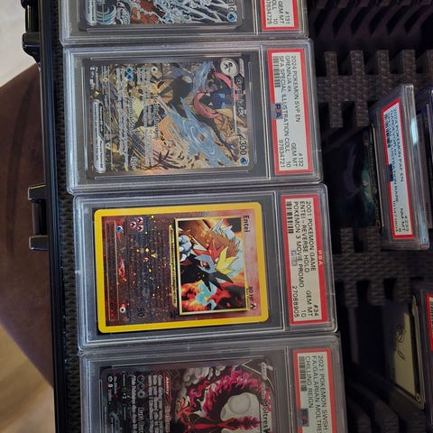 Pokémon Prismatic Evolutions Premium Figure Collection med samlefigurer og kort. Inneholder flere Pokémon-figurer og tilhørende samleobjekter i eske.