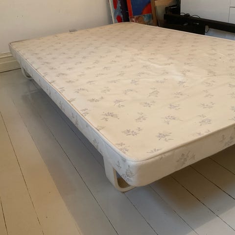 Svart sengramme og hvit madrass.
