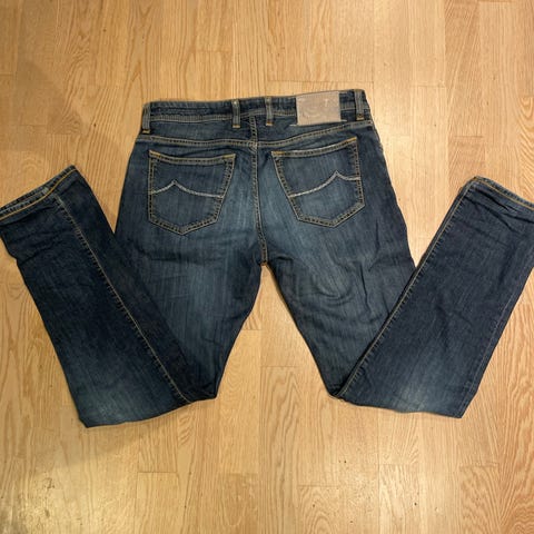 Jacob Cohën jeans i blå denim, størrelse M med midjemål W33. Jeansene er i modell 622 som er den eldre modellen av Nick. Buksene er lagt opp til å passe meg på 180.