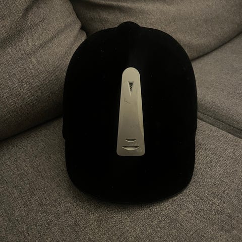 Pent brukt, men har en liten flenge i stoffet etter en skuffekant. Ingen merker i selve hjelmen.