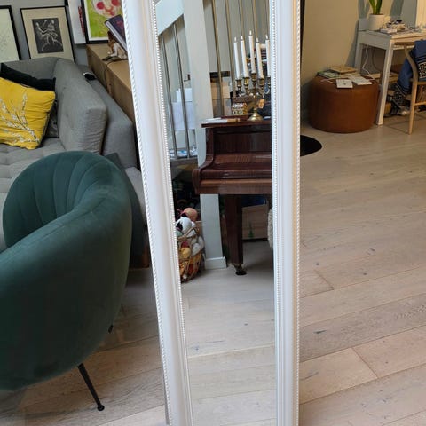Jysk Orstrup gulvstående speil med hvit ramme. Følger med hengsler på baksiden. Selges pga flytting😊 Hentes, eller leveres av meg i Oslo-området for totalpris på 500kr. Noen bruksmerker på rammen, men ikke noe som synes godt. Rammen kan males da den er i tre