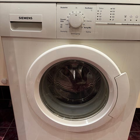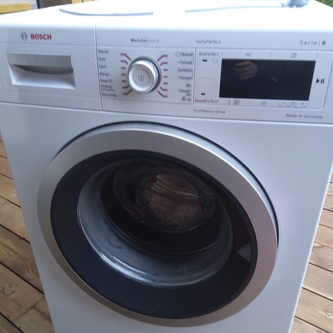 Bosch Frontmatet vaskemaskin med digitalt display og flere vaskeprogrammer. Maskinen har en frontmatet dør for enkel tilgang til trommelen.