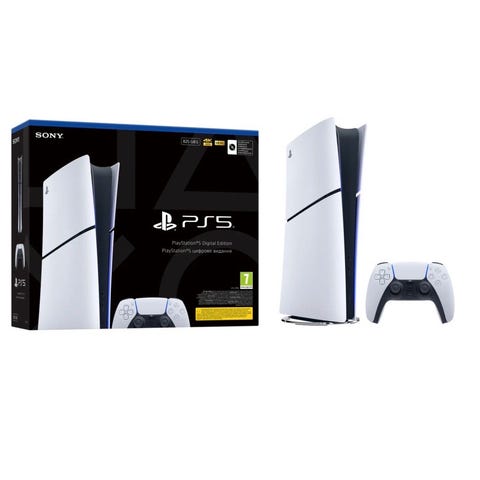 Sony Playstation 5 slim spillkonsoll i hvit farge. Konsollen har et moderne design og leveres med en svart kontroller. Passer til spilling på Playstation-plattformen.