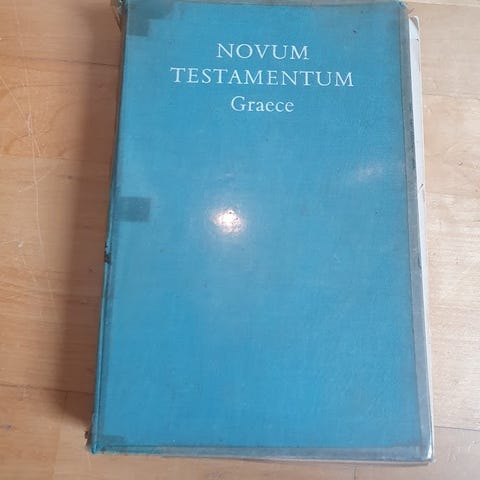 Novum Testamentum Graece bok med kritisk apparat, redigert av Eberhard Nestle, Erwin Nestle og Kurt Aland. Utgave fra United Bible Societies, 1969. Tekst på gresk.