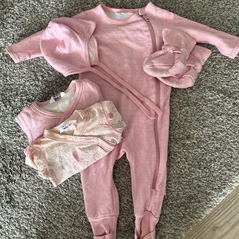 Joha ullsett med body og bukse i merinoull/bambus. Omslagsbody og bukse med fot, som begge er perfekt for en liten baby. Pen lys rosa farge🩷 Pent brukt av ett barn. Ingen anmerkninger. Størrelse 60 som tilsvarer 56/62.