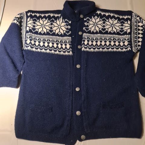 Selger en retro ullgenser / kofte med en knapp. Ullgenser i grønn og kremhvit ,