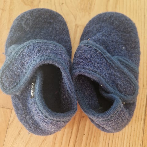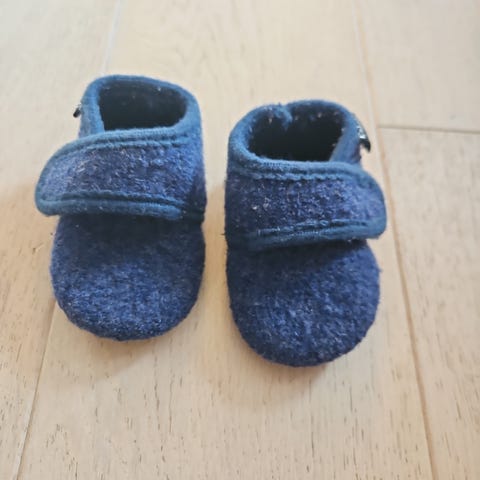 Myke, varme ulltøfler fra CeLaVi, ca str 20. Mørkeblå farge. Løs ullsåle inni som går an å ta ut og brukes uten. Brukt en vinter inne av ett barn.