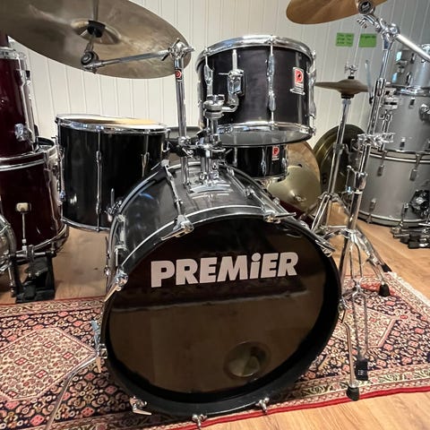 Noe mindre riper, og noe rustslipp på utsatte deler. Cymbaler og stativ er av varierende kvalitet og alder, men ingen sprekker.