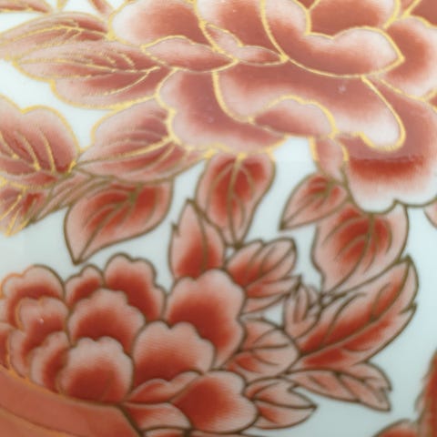 Dekorativt sett med italiensk Capodimonte-porselen, bestående av to lokkede skåler/urner i klassisk stil. Rikt dekorert med putti-motiver, relieffdetaljer og gullstaffering. Merket Italy i bunnen med produsentstempel og modellnummer.