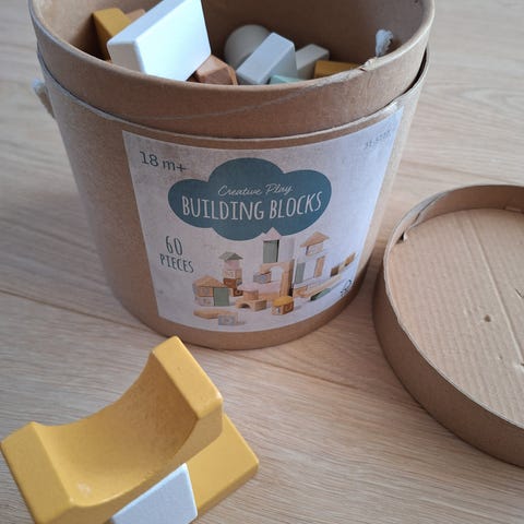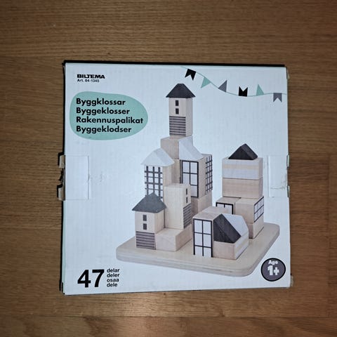 Uåpnet Creative Play Byggeklosser fra Clas Ohlson inneholder 60 treklosser i ulike former og farger. Passer for barn fra 18 måneder og oppover. Klossene kan brukes til å bygge og lære bokstaver, tall og former, og bidrar til utvikling av finmotorikk og kreativ lek.
