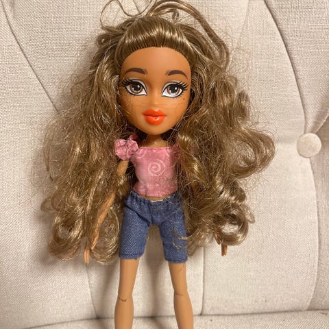 Barbie dukke med langt lilla og brunt hår og rosa kjole med jordbærmønster. Selges for 100 kr . Kan sendes med post nord for 70 kr eller fiks ferdig eller kan hentes etter avtale .