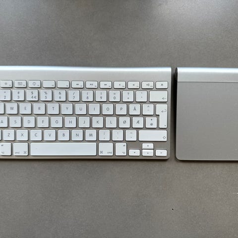 Selger Apple trådløst aluminiumstastatur og Apple Magic Trackpad (1. generasjon).