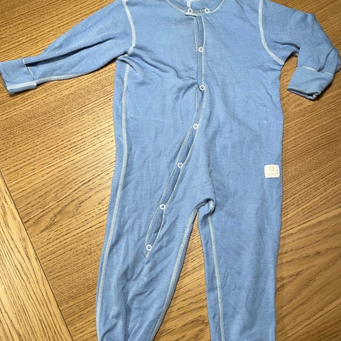 Blå pysj fra Refleks: 49 % ull, 43 % bomull, 8 % polyamid. Liten flekk på brystet som ikke går bort.
